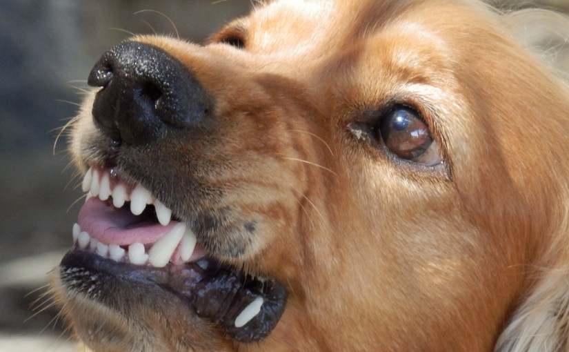 Aggressive dog, threatening dog, showing teeth, growling, staring eyes, possible dog bite as next step